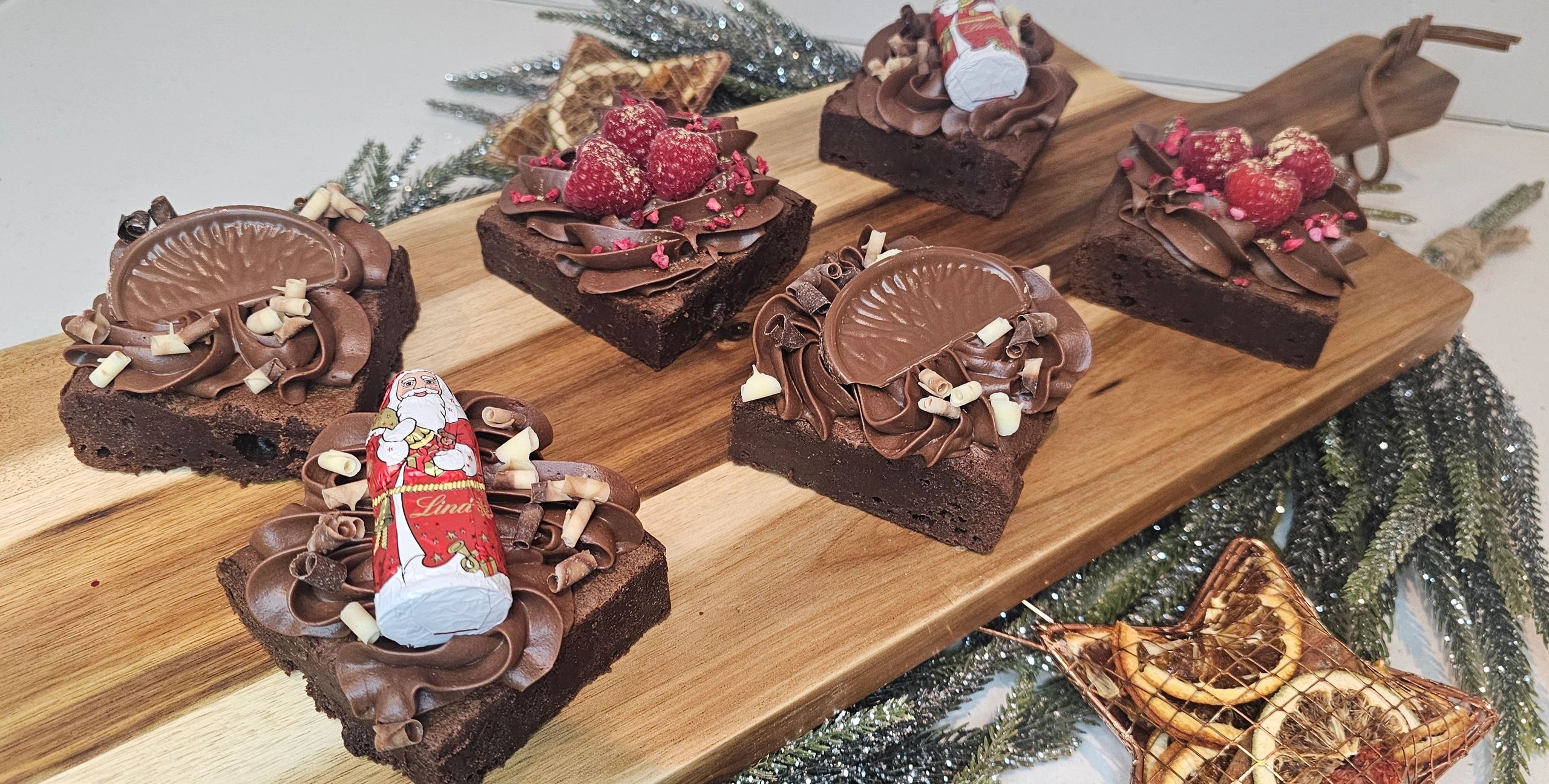 Three rich and fudgy chocolate brownies, decorated with a thick chocolate ganache swirl. The two outer brownies are finished with a chocolate Santa, with the central brownie adorning a golden acrylic 'Merry Christmas' disc presented in a luxurious clear gift box.