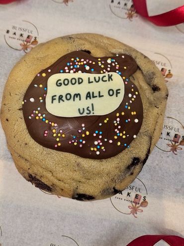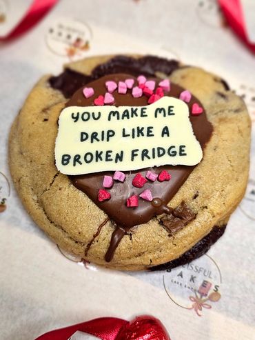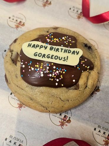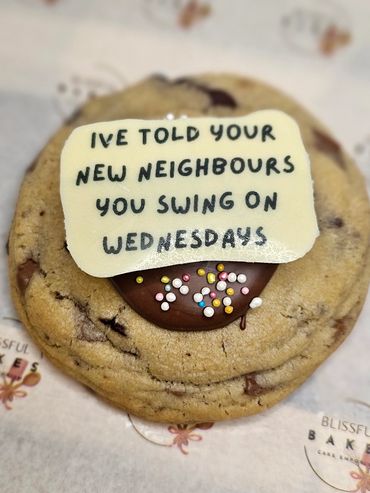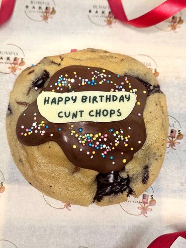 A large chunky 'NYC' style chocolate chunk cookie with a chocolate ganache centre, decorated with milk chocolate, and a white chocolate message printed with edible ink. The message can be cheeky or polite but please note we will not print racist messages.